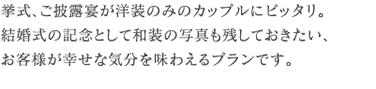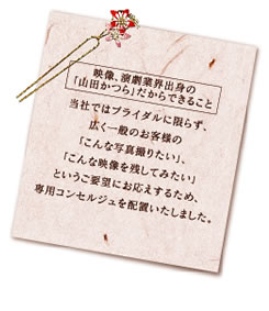 | 1.ご新郎、ご新婦様ご衣装(各1点) 2.ご新郎様ヘアメイク、ご新婦ヘアメイク 3.かつら(文金高島田標準タイプ、飾りつき) 4.写真スタジオの手配(写真代はお客様のご負担となります) ※七分かつらご利用のプランは、\20, 000アップとなります。 |