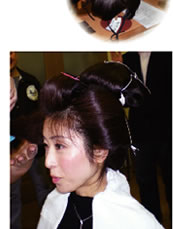 和装ブライダルのお打ち合せでは、まず、挙式からご披露宴へと続くブライダル全体のスケジュールを詳しくお伺いするところから始めさせていただきます。和服をお召しになるタイミング、お色直しの有無・ご衣装の種類・ご希望の雰囲気などをお客様からお伺いしお話を進めさせていただく中で、弊社が提供するかつらを、どの様な形でブライダルの中で活かしていくか、じっくりとご相談させていただきます。