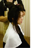 弊社では豊富に取り揃えた花嫁かつらの中から、まずお客様に一番フィットするかつらを選び出します。その上で、実際に装着してみて、違和感を感じる部分をお伺いし微調整が必要な箇所をチェックしていきます。その上でお客様の顔のラインに一番似合うように、髷(まげ)や鬢(びん)の形を調整し、挙式までの期間で結い直し仕上げていきます。