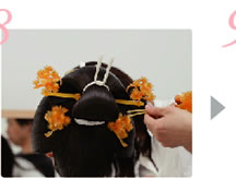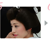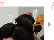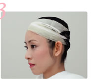後れ毛に注意して、羽二重を巻き付け固定します。 |