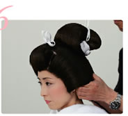 総かつらの場合、お客様の髪の毛を全て羽二重で固定してしまいますので、例えば次のお色直しが洋装の場合でも、髪の毛をあらかじめカールしておいたり下準備ができて、とても便利なんですよ。 |