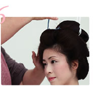 仕上がりが自然な七分かつらなにはナチュラルなお化粧がよく似合いますね。お客様とよく相談しながら、花嫁の初々しさが出るようなメイクを心がけています。 |